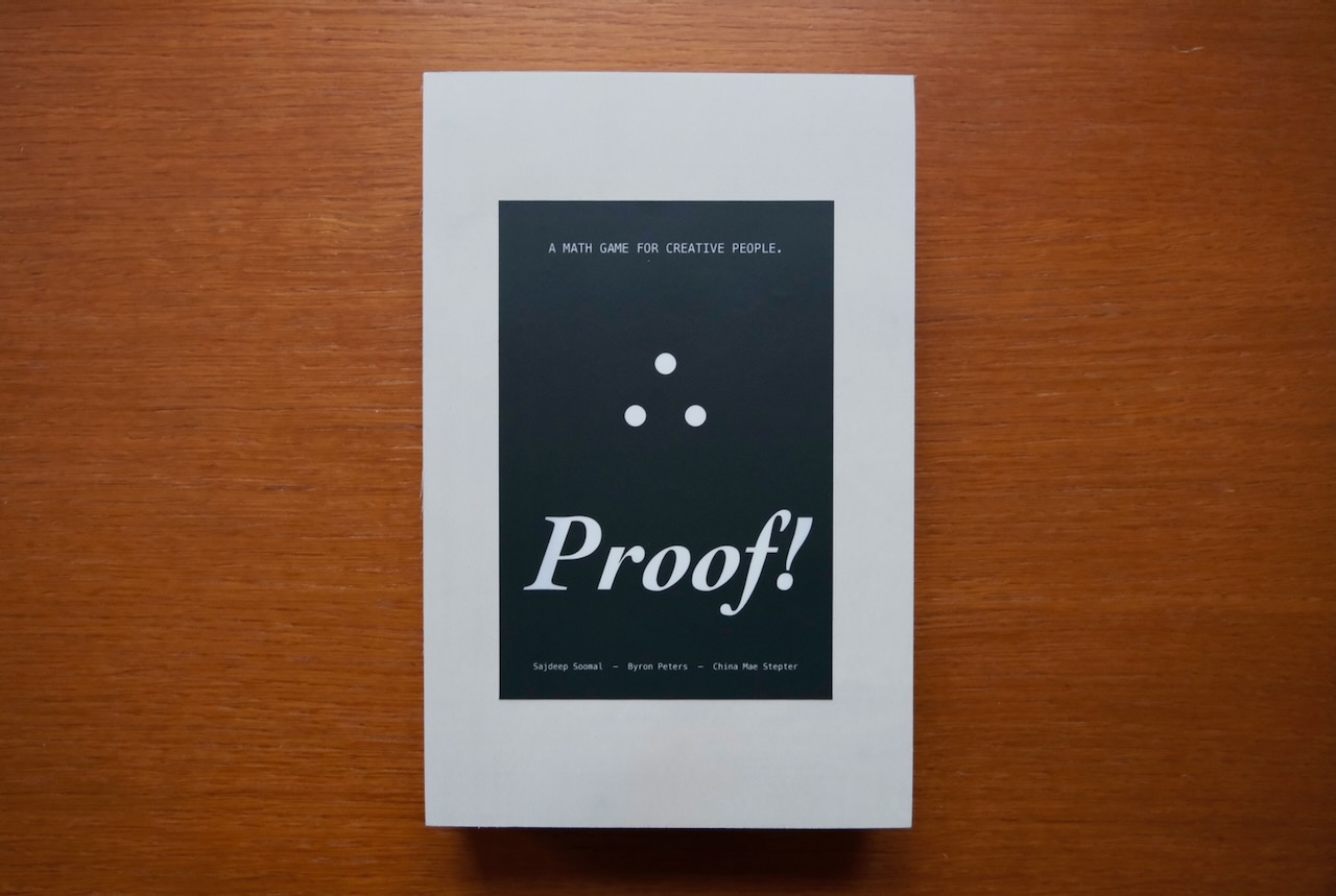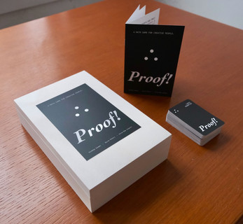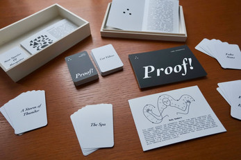 In Proof! players use their creativity to connect a single mathematical equation to a real-world scenario in humorous, absurd, or thought-provoking ways. Each round, the "Judge" presents an equation, and the other players must use a single-word Prompt Card to come up with a unique connection. The Judge picks the best answer, and the winning player earns a point. The game resists the universalizing impulse of calculation, instead offering a momentary rupture where the infinite potential of the equation is allowed to expand outward, spilling over into the unpredictable multiple.